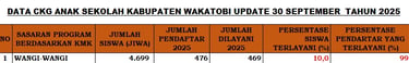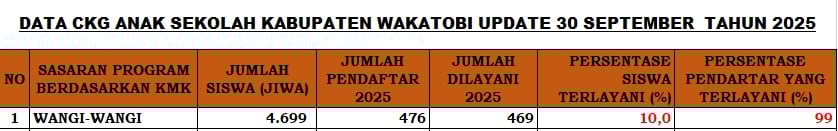 Disisi lain Cek kesehatan Gratis pada anak sekolah dengan sasaran sebanyak: 4.699 anak, Jumlah Pendaftar : 476 anak, Jumlah yang Dilayani 2025: 469 anak, Persentase Siswa Terlayani: 10,0% dan Persentase Pendaftar yang Terlayani: 99%.